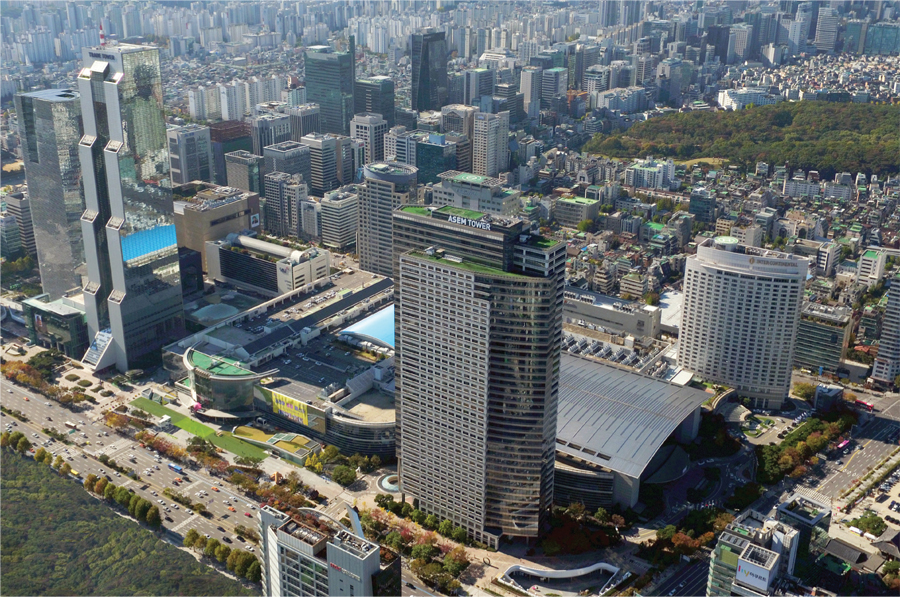 아셈타워는 지하철 9호선(봉은사역)에 바로 연결되는 북동쪽 위에 소재하고 있는 최첨단 인텔리전트 빌딩입니다. 지상 41층, 연면적 4만4,486평(지하 4층~지상 41층)의 매머드 빌딩인 아셈타워는 2000년 ASEM정상회의 개최를 위해 건립되었습니다.