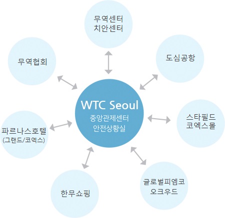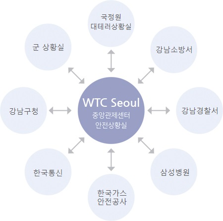 무역센터는 ‘초고층 및 지하연계 복합건축물 재난관리에 관한 특별법’ 적용대상 시설로 국민안전처, 강남구청, 소방서, 경찰서 등 유관기관과 협력하여 화재 및 재난에 대응하고 있습니다.